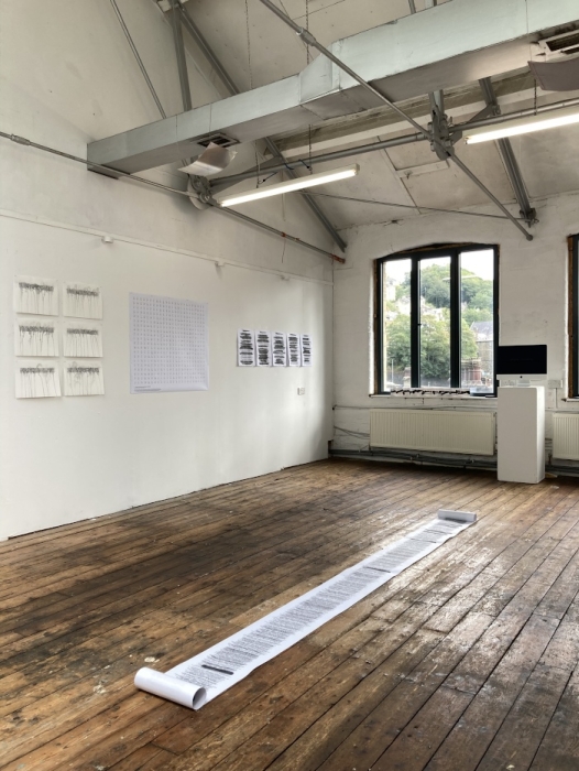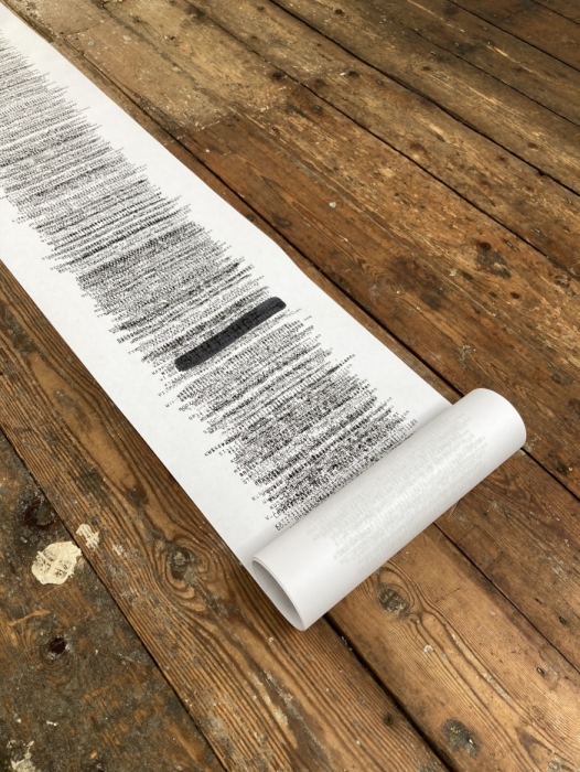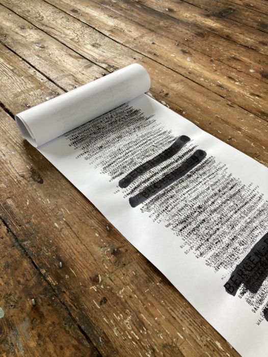The long, digitally printed scroll currently displayed in the gallery remains a work in progress for me. Each version I’ve created is both a memorial reading and a performance of the names. A copy of the original USHMM document is available for visitors to view the original list and information.